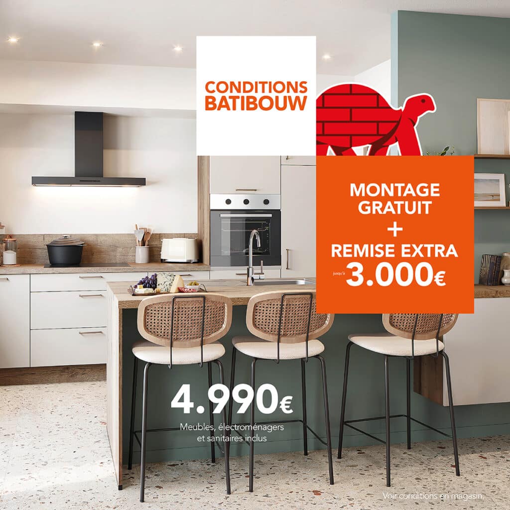 Profitez, dès maintenant de nos conditions Batibouw: montage gratuit + jusqu’à 3.000€ de réduction sur votre nouvelle cuisine ou aménagement d’intérieur !